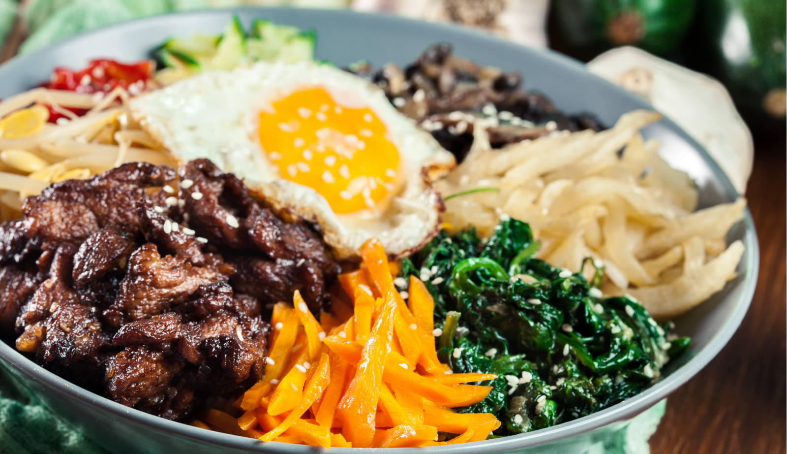 É ali que nasceu o bibimbap, que significa literalmente “arroz misturado” (de bibim, misturar, e bap, arroz), considerado o mais tradicional do país — uma combinação harmoniosa de arroz, vegetais sazonais, carne, ovo e pasta de pimenta fermentada. Parece simples. Mas é uma aula de equilíbrio.
